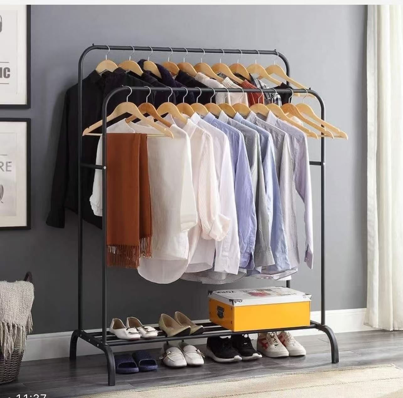 كما يظهر في الصورة، هو عبارة عن حامل ملابس معدني أسود اللون،